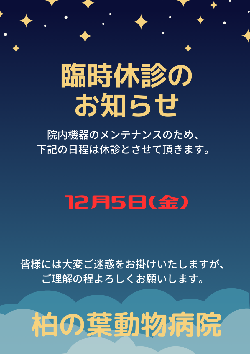 院内機器メンテナンスのため、12月5日(金)は休診となります。 大変ご迷惑をおかけしますが、ご理解とご協力の程よろしくお願い致します。